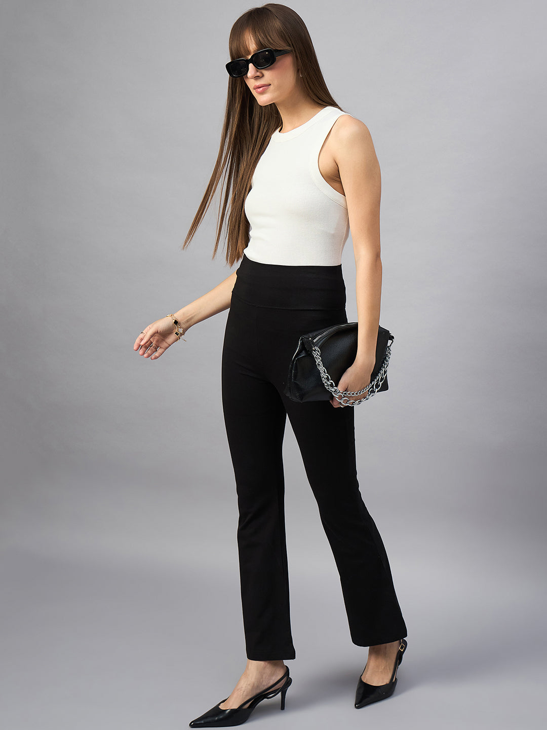 A woman wearing 98degreenorth Women’s Navy Stretchable Trousers stands by a desk in a bright office with city views.