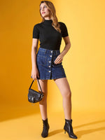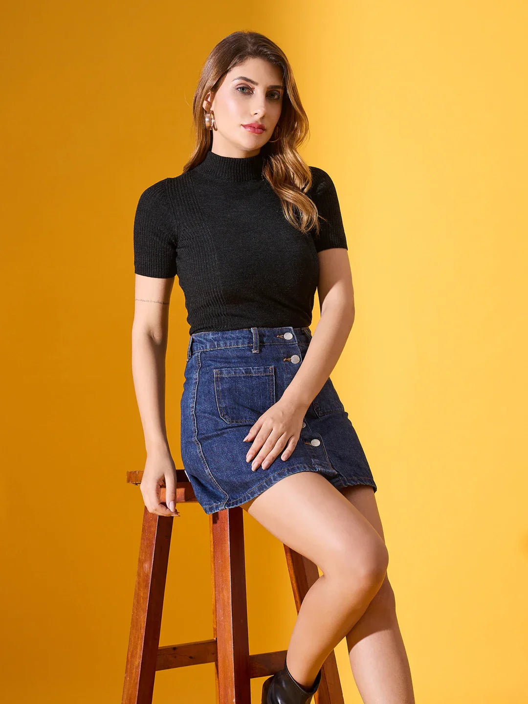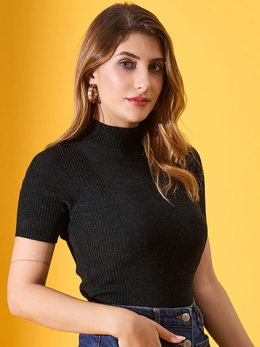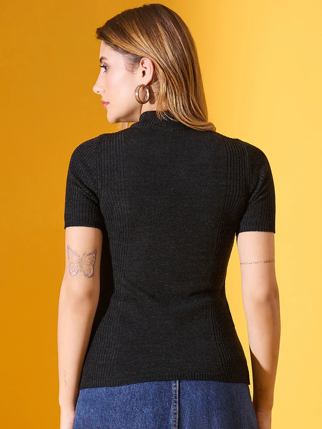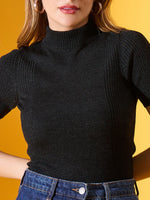 Keywords: women’s charcoal grey sweater, ribbed knit turtle neck, slim fit half sleeve top India, 98 Degree North