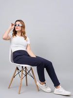 Keywords: women’s navy slim fit trackpants, cotton stretchable straight pants India, casual office wear bottoms, 98 Degree North