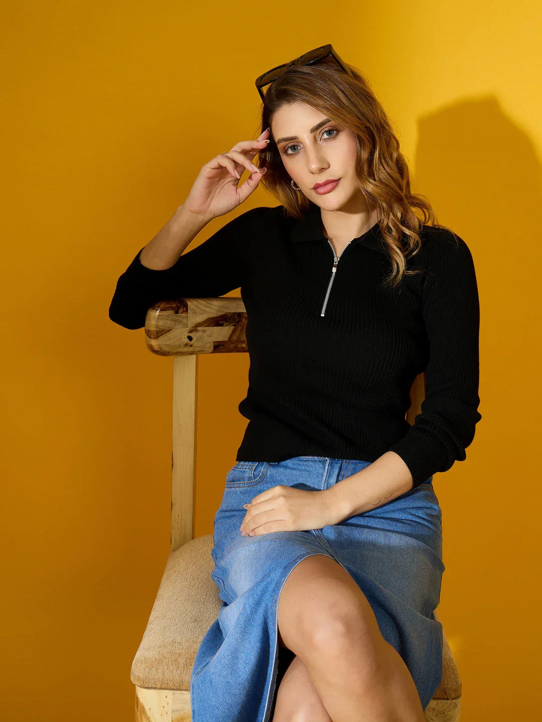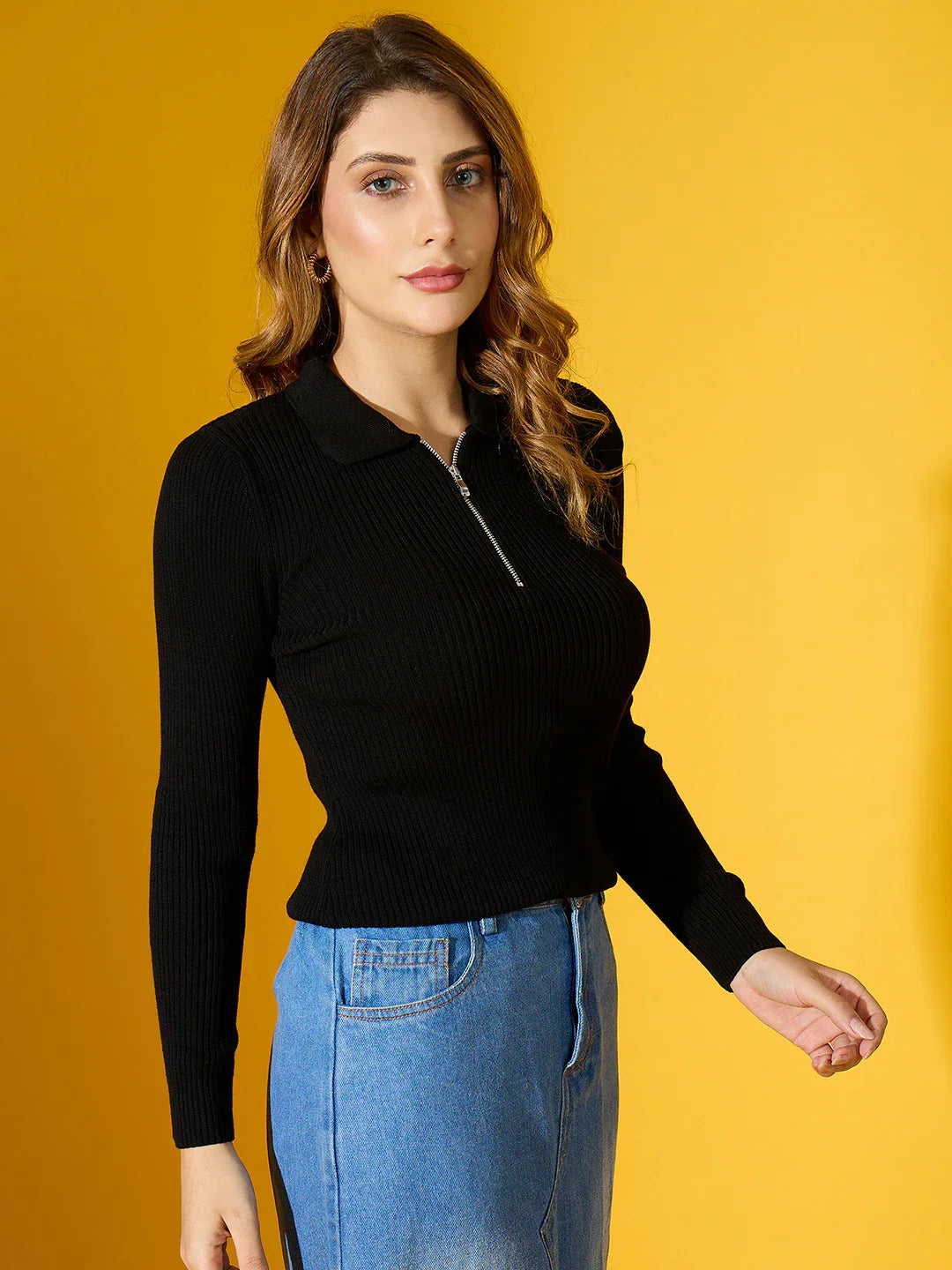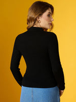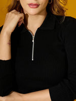 Women's Black Ribbed Collar Zipper Sweater – Slim Fit Long Sleeve Knitwear for Casual & Office Wear