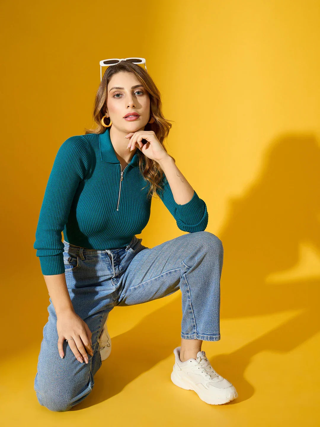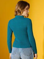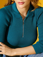 Women's Teal Ribbed Collar Zipper Sweater – Modern Long Sleeve Knit Top for Work & Casual Dressing